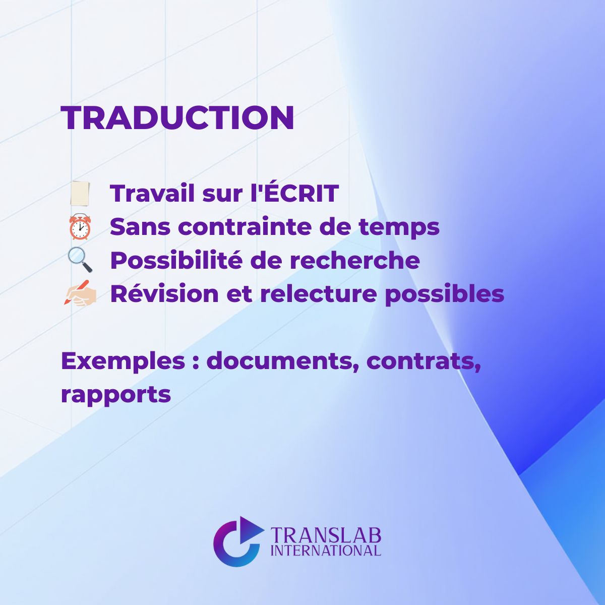 At Translab International, we help you choose the right expertise adapted to your actual needs to guarantee your message's impact.